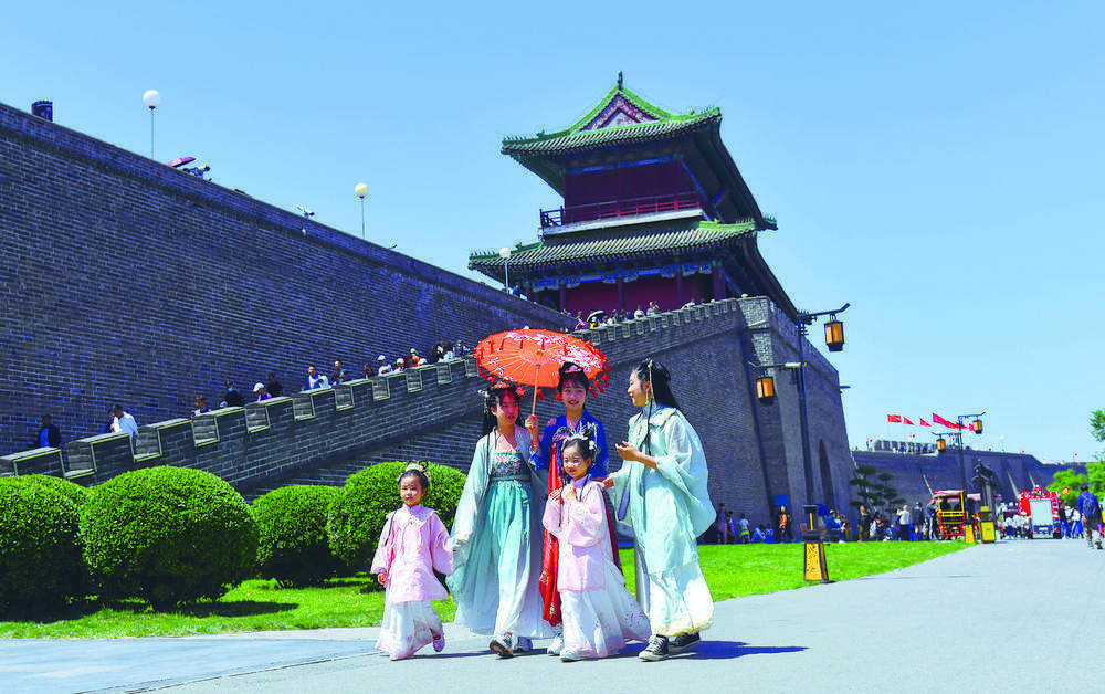 r漫步正定古城街巷,宛若步入时光长廊,一步一景皆成画卷;南城门广场上,游客往来穿梭,或驻足拍照定格塔与城的同框,或轻声交流探寻古建故事,热闹的人气与静谧的古塔相映成趣,让这片千年土地更添鲜活生机;荣国府内随处可见身着汉服、簪花饰发的游客,在流光溢彩的灯饰与古雅建筑间流连拍摄,古今交融的景象别具风情。