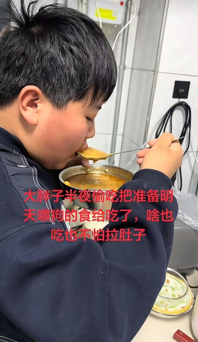 照样半夜起来端起来吃,生的肉馅都能下肚,这孩子究竟饿到了什么地步?最离谱的一条视频里,是男孩半夜起来偷吃狗食,是的各位没听错,就是用玉米面勾兑的狗食,这孩子已经到了什么都吃的地步了。