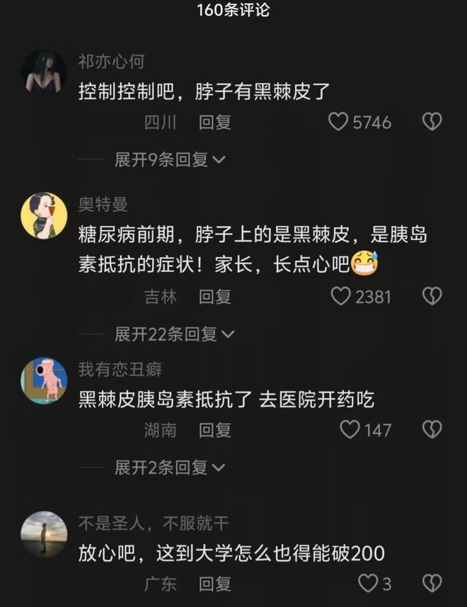 就连评论区的网友都看不下去了,直言:孩子脖子、关节处都黑了,这是典型的黑棘皮,是胰岛素抵抗的症状,如果这个时候家长还不给孩子减肥的话,很容易患上糖尿病,到时候后悔都来不及了。