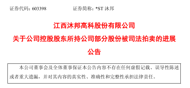 1月29日,*ST沐邦发布江西沐邦高科股份有限公司关于公司控股股东所持公司部分股份被司法拍卖的进展公告。